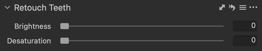 It allows you to adjust the Brightness and reduce Saturation (i.e., remove color tint) of the teeth. Like Retouch Face Skin, the tooth selection is fully automatic, and if you need to adjust multiple people differently, the selection is managed through the Retouch Face Selector tool.