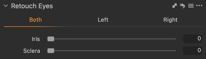 This tool offers separate sliders for the Iris and Sclera. Adjusting the iris increases brightness and contrast without significantly affecting color saturation. Adjusting the sclera brightens and optionally desaturates it. The tool preserves fine details, such as small veins, which helps maintain a realistic appearance. Eye detection is once again fully automatic. You can fine-tune the intensity separately for the left and right eye (Left and Right tabs), and — just like with the other tools — make independent adjustments for multiple subjects in a photo via the Retouch Face Selector.